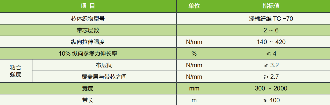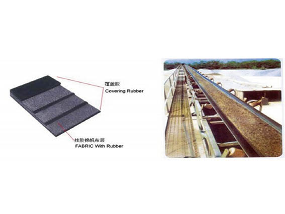以經(jīng)、緯向全棉(或滌棉混紡交織)帆布作為骨架層,帶體具有柔韌性及成槽性好,而且價格較低于其它材質(zhì)的輸送帶。
